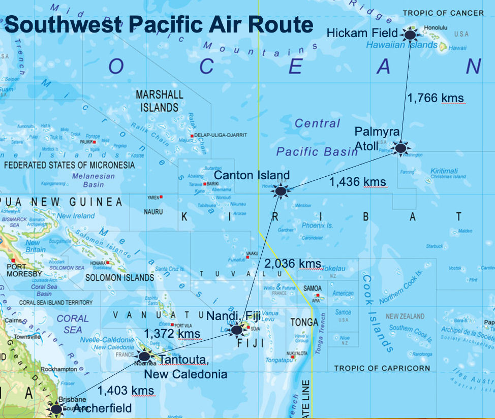 It would take about a month before the B-26s were ready for the long flight to Australia. The first flight of B-26s of the 19th Bomb Squadron were ready for the 5,100 mile flight to Australia on 15 March 1942. They were scheduled to depart on 16 March 1942. It was then planned to have three to six B-26s take off every day after that, until all 57 crews had left Hawaii. The Southwest Pacific air route from Hawaii left Hickam Field for Palmyra Atoll, then Canton Island, on to Nandi on Fiji, then Tontouta, New Caledonia and finally Archerfield Airfield in Brisbane. The 33rd, Headquarters, 2nd Bomb Squadrons and the 18th Reconnaissance Squadron were to follow the 19th Bomb Squadron to Australia in that order.