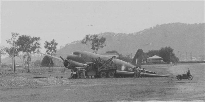 We had been standing at our front fence watching the Douglas land just in front of us. It touched, ran a hundred yards or so, then the port undercarriage collapsed, it pivoted on the left wing tip and right wheel to end up facing towards us. A tractor trundled out from the R.A.A.F. Base, hooked on, and ignominiously towed it away.