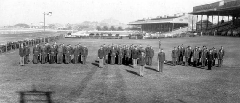 The first members of the 43rd Bomb Group arrived in Sydney onboard the Queen Mary on 28 March 1942. They marched in heavy rain to Camp Randwick at Randwick Racecourse. The enlisted men cleared the straw and feed our of the horse stables to turn them into sleeping quarters for the men. They stuffed large sacks with hay to use them as mattresses. Many of the men were woken through the night covered in itchy bites from the insects living in the hay. When proper cots arrived they burnt the hay to attempt to eradicate the insects.