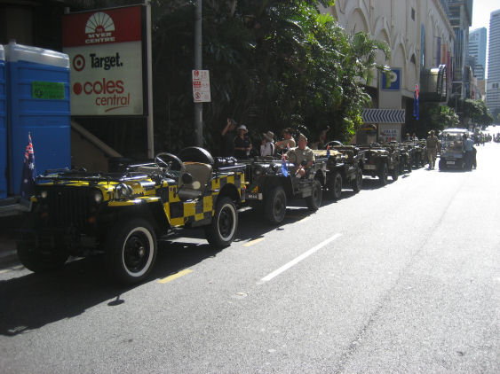 Jeeps in line in Elizabeth Street waiting to carry veterans in the Anzac Day parade