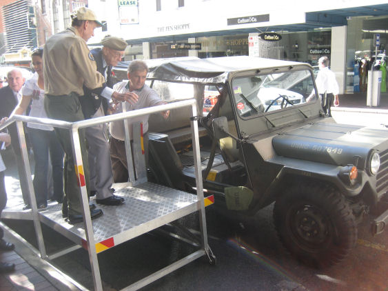 Veteran climbing on board his Jeep in Elizabeth Street via a specially designed platform