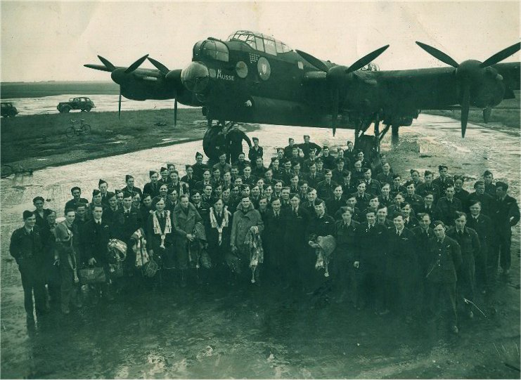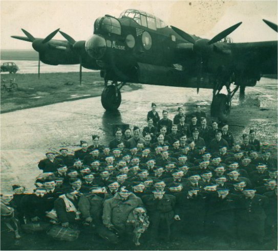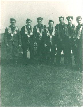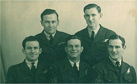 Tomlinson's Circus at Sandtoft L to R: John Kinghorn (rear gunner, Byaduk, Vic), Jack Edmonds (Wireless Operator, Sydney), Arthur Brown (Skipper, Chinchilla, Qld), Wally Rob (Navigator, Northampton, WA), Ray Statham (Mid gunner, Manchester, England), Herb Paton (bomb-aimer, Launceston, Tas) |