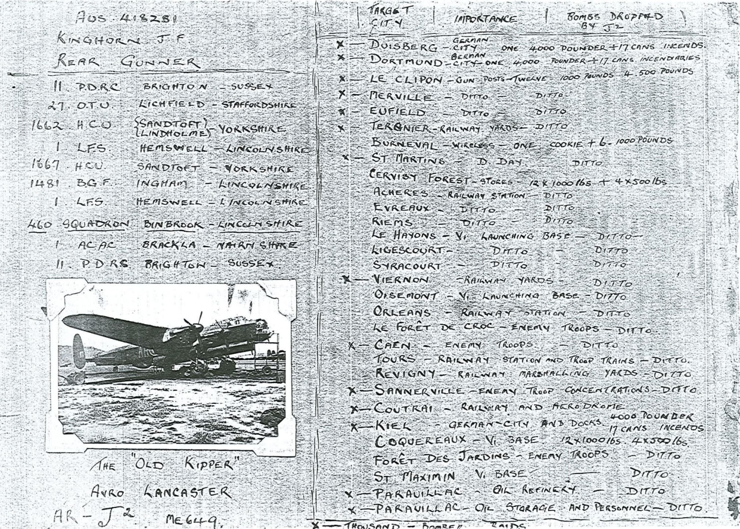 Hello - my name is Sally Kinghorn and my father was John Francis Kinghorn (WO 418281). Dad was a rear gunner with the 460 Squadron. Attached please find 9 photographs and also a jpg file of dad taken about four years before he died (2.12.97). I thought they maybe of interest to you.