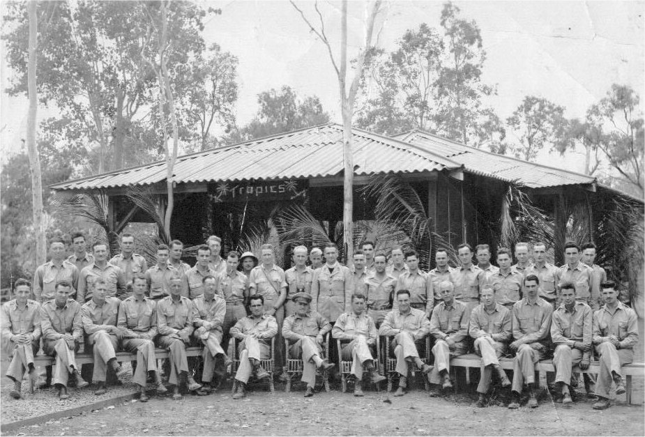Photo of all the Townsville Air Depot Officers taken in late 1942 or early 1943 in front of "The Tropics," the Officers' Club. Col. Bertrandias, the Commanding Officer is sitting in the center of the front row with a cap on. Robert Bolton is 9th from the right in the back row. Most of the others to Robert's left are members of the 911th Signal Co. |