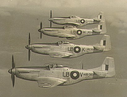 | Mustangs of 84 Squadron - Mustang A68-565 of Squadron Leader Cox in the foreground. A68-529, A68-526 and A68-523 are the next three Mustangs in the photo | |