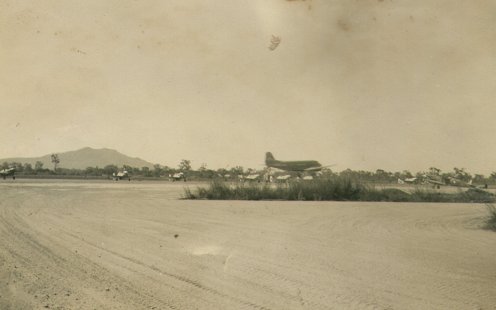 | Dakota taking off (or landing) at Ross River airfield in Townsville. Castle Hill can be seen in the background. Mustangs in the background and a single Spitfire at the right of the photo | |