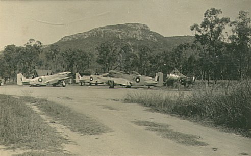 | A number of Mustangs of 84 Squadron RAAF at Ross River airfield in Townsville. Mount Stuart can be seen in the background. | |