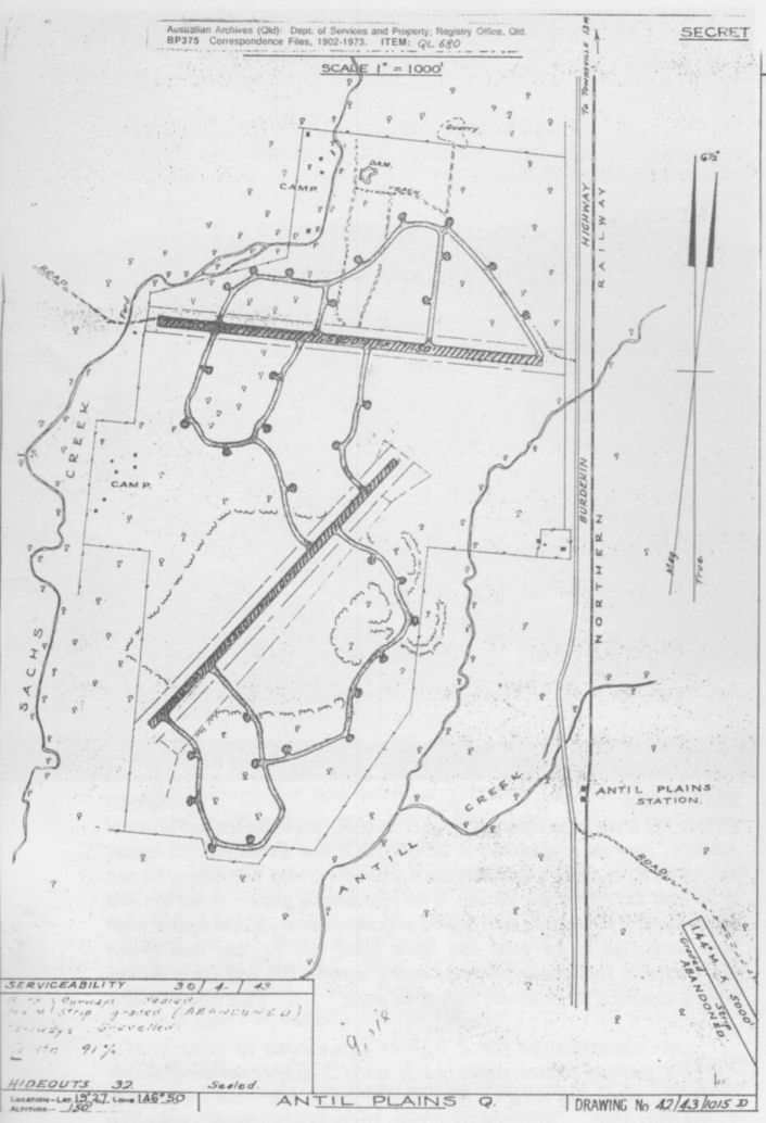 "... On the western side of the Townsville-Charters Towers railway line and road, and on the northern side of Antil Creek. This site is an excellent one. the clearing is light and a full size drome could be rapidly constructed.... Only a thin skin of gravel would be required for runways. The Main Roads Engineer assures me that ample gravel supplies would be available nearby. The water supply could be obtained by sinking spears into Antill (sic) Creek...."