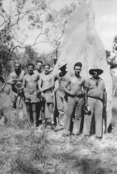 "The first camp at Antil Plains was about fifteen miles south of Townsville, over a road just begun rebuilding, for it was pitted with holes, scarred with deep ruts and thick with heavy dust. The runway was a long, natural plain, banked on all sides by the eternal forest of eucalyptus trees which served during the last days of the stay there as a place of heavily camoflaged, and difficulty accessible revetments. The departmental tents were scattered all along the fifty-five hundred foot strip, and before the telephone system was completed more than ten miles of wire had been laid. There was no water in camp. Drinking water was hauled in from the edge of Townsville, and the creek that edged the camp was used as a bathing place until the total dusty ride into town to get a shower. Grayish-brown, crusty anthills rose by the hundreds out of the parched ground, often to heights of three and four feet or more, and in some places they dotted the aisles of the dust-green forest so thickly as to give the effect of sparsely cobbled streets. The heat was there, but it was lighter, easier heat than that at Lowood. The nights were freer of mosquitoes, altho the first case of Dengue fever came at the Antil Plains Camp."