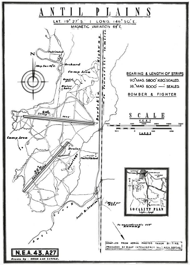 The construction of an interceptor fighter field at Antil Plains, near Townsville, was requisitioned early in 1942. This involved the construction of two flight strips each 5,000 feet long and 150 feet wide with approaches, taxiways, dispersal strips, hardstandings, and camp accommodation for two squadrons with access roads, paths, and fencing. Flight strips and taxiways were laid to a strength to accommodate the heaviest types of aircraft.