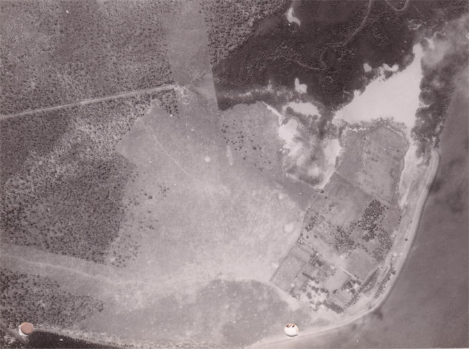 The WWII Bathurst Island Airfield was a mostly all-over grass airfield. The RAAF guide states that there were three runways. You can see a partial runway at the top left in the 1940 photo below. And the 1941 photo below seems to show the other two partial runways. This WWII airfield is almost 2 kilometers from the current civilian airfield which was built in the 1970s. The main township now covers the site of the WWII airfield.