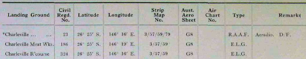 The Alphabetical List of Landing Grounds - Queensland shows the following entries for Charleville"-