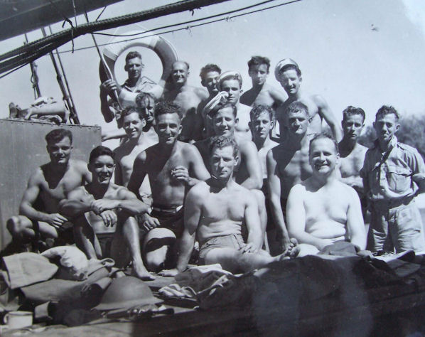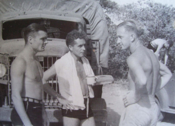LAC Ronald Holmes at left and two friends in front of RAAF truck