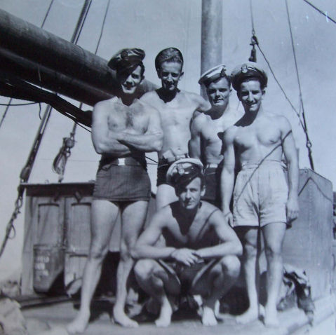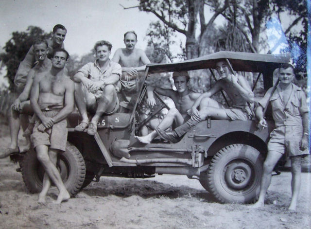 Group of men with their jeep, LAC Ronald Holmes at far right