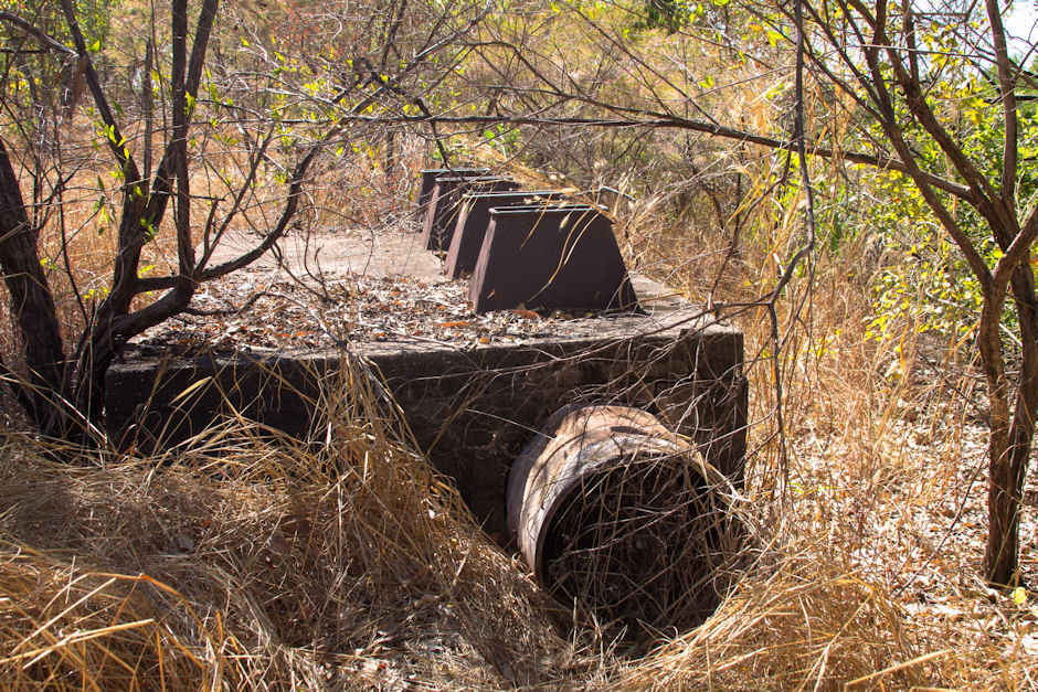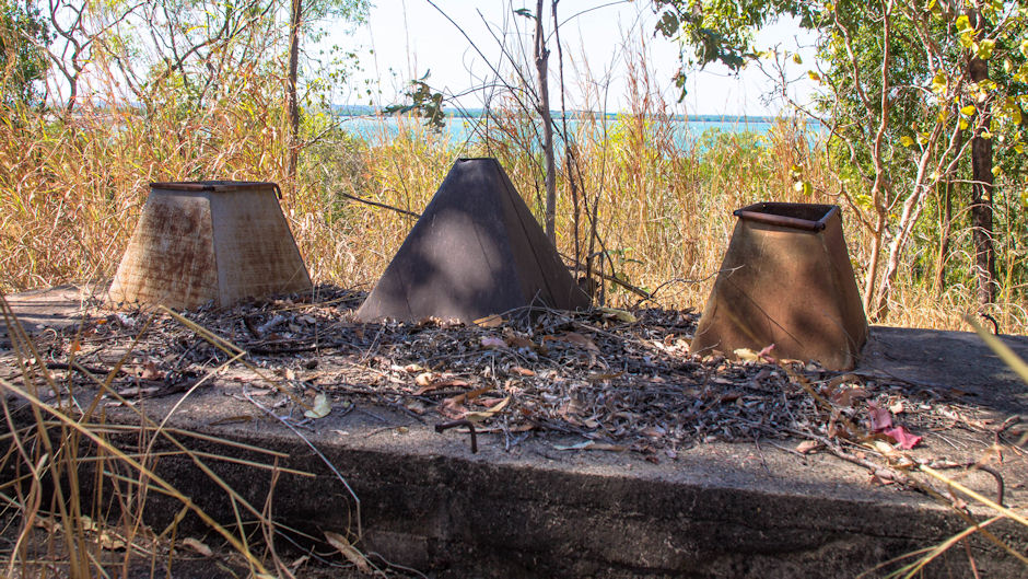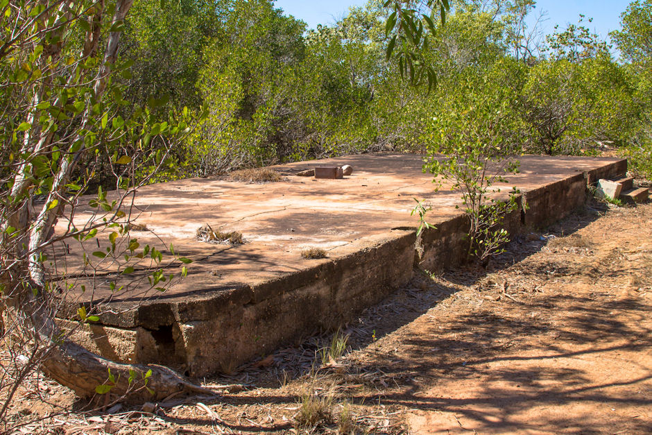 All that remains of the WWII East Arm Flying Boat Base is the crash boat slipway, remnants of a jetty, a tarmac and parking apron, and ramp and a two large concrete mooring blocks.