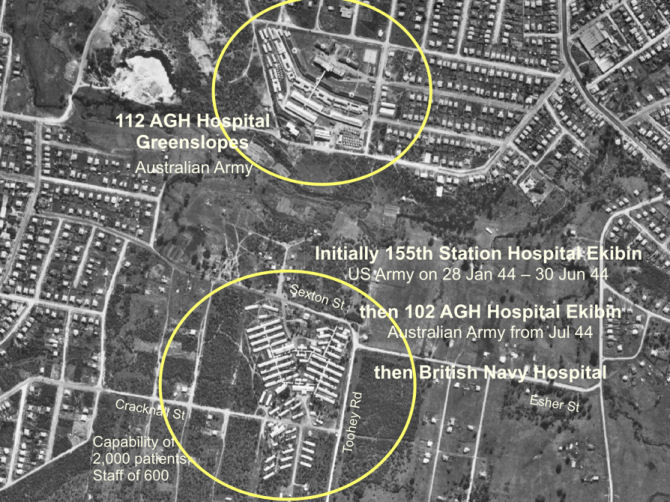 The Ekibin Hospital was initially established by the Office of the Base Engineer, Base Section 3, USASOS, SWPA. It was capable of looking after 2,000 patients with a staff of about 600 personnel. Ekibin Hospital was bounded by Sexton St to the north, and Toohey Rd to the east. It straddled Cracknell Rd and covered parts of Effingham St., Fingal St., and Lutzow St. The nurses quarters were located south of Cracknell Road. The boiler rooms were located where the Golden Fleece Service Station was built years later. Buildings 40 feet by 10 feet were erected inside the compound which was surrounded by a high barbed wire fence. Local traffic was not permitted to travel along Cracknell Road through the hospital complex.
