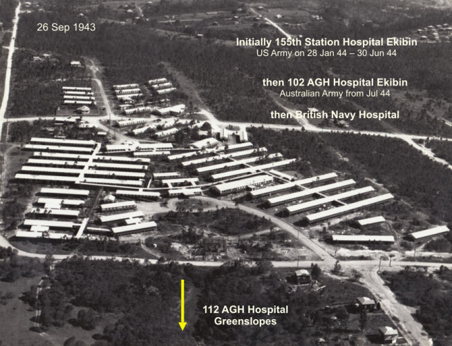 The Australian Army 102 Australian General Hospital (102 AGH) occupied the Ekibin Hospital from July 1944. When the 102 Australian General Hospital (102 AGH) relocated to the Holland Park Hospital after it was vacated by the Americans, a British Navy Hospital occupied the Ekibin Hospital. It is believed that the Ekibin site may have been reoccupied by another Australia Army Hospital unit after the British Navy vacated the hospital site.