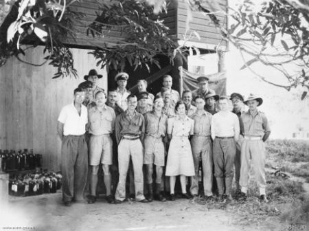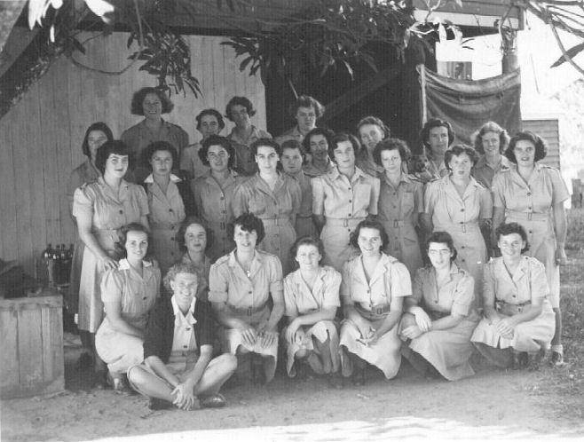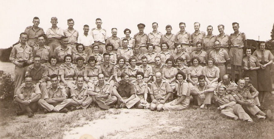 Back Row (L to R):- Capt. Nick King, RAE., Dr. Hugh Ennor, Capt. Howard Skipper (USA), Frank Pasquill (UK), Lt. Doug Kerr, Capt. Bavistock, Lt. G. Simondson (AWAS), Lt.Col. F.S. Gorrill (RAMC), Major David Sinclair (RAMC), Clifford Purkiss (UK), not known, David Bland, Not known, John Legge, Fl. Lt. Reg Taylor (RAAF).1st Row from Back (L to R):- Hal Hoffmann (USA) photographer, Abe ? , Private Murphy, Maisie Dart, Elma Reeve, Olive Lucas, Les Hawkins, "Chips" ?, Jean Wilkin, Sylvia Stoltz, not known, not known, not known, 2 visiting AWAS not known. 2nd Row (L to R):- John Duncan, Frances Abraham, Carmel Diviny, "Tommy" Kennedy, Fay Brazill, Eric Adams (RAAF). Marie Matthews, Maud Murphy, "Snowy" Waters, not known, Mary Brady, Sgt. Chapman (Cook), Lucette McNab (known as "Tex Morton"), Betty Roberts. Front Row (L to R):- Alan Quick, Bruce Tucker, Max Greenwood, Walter Lockwood, Roy Hay, Peg Nelson, Cpl. Wynne, Betty Greene, not known, not, known, not known. At Front on right end:- Not known, Cpl. Jim Tidy |