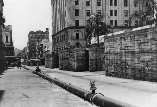 During WWII numerous Air Raid Shelters were built in Elizabeth Street, Brisbane, Queensland. A large water pipe was also installed in the street to fight fires during and after any possible Japanese air raid. It was supplied with water from the Brisbane River. Large pumps and motors were installed on the banks of the Brisbane River to pump the water through the large pipes.