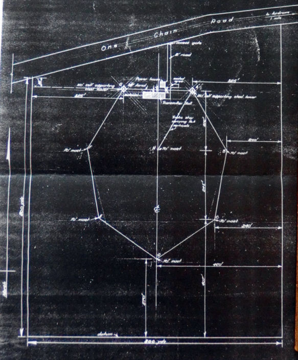 The National Archives of Australia plan below shows two 150 feet self supporting towers at either end of the Transmitting Building and five 70 foot masts located to the south of the building forming a heptagon shape, plus an extra 70 foot mast slightly north of the centre of the heptagon. It also shows the Transmitter Hall and the Power House.