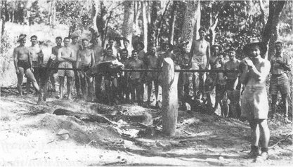 Some pigs were kept and fed with the scraps from the camp. At an appropriate time BBQ Pork was on the menu!! Some calves were also kept and fed in the camp area. Their egg supplies were from about 50 chickens kept in the camp area. Fish traps were located in the bay. Their isolation led to these measures being taken. The animals also provided an element of companionship for the men thus improving morale.