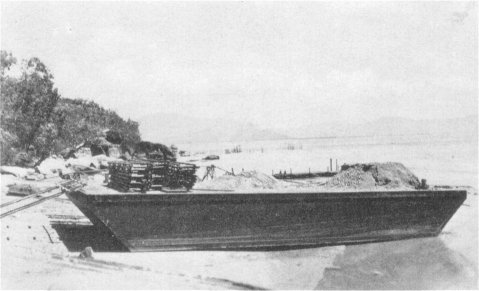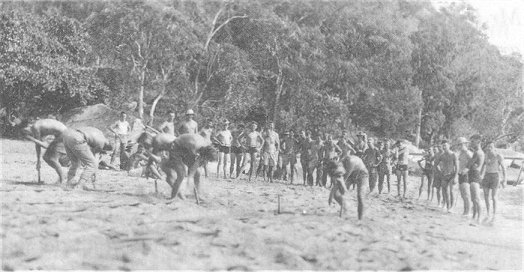 Lt. Harvey took the first party of 30 men to False Cape on a borrowed US Navy landing barge. Once they had erected their tents at Sunny Bay, work started on the erection of a small jetty on the beach. A small Caterpillar borrowed from the Civil Construction Cops (CCC) was used to unload equipment and supplies from pontoons.