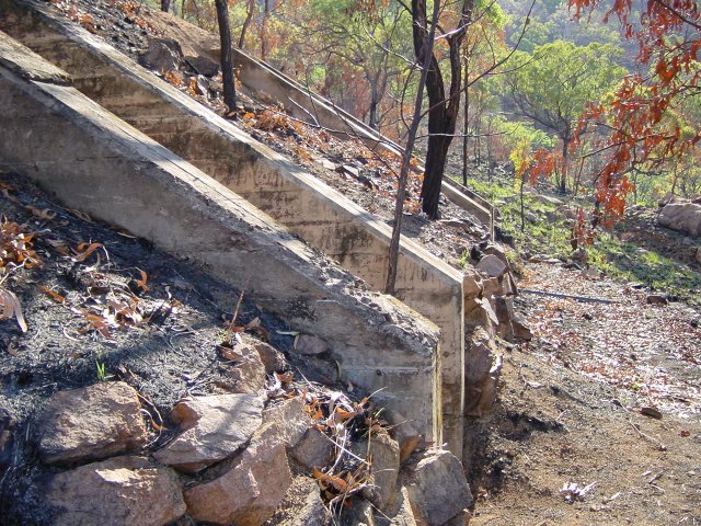 A rock retaining wall is located in front of the Command Post. This wall leads to a smaller wall supporting a path that leads directly off the edge of the Castle Hill road in to the underground room or bunker. Some have suggested that the steel doors have been removed from the two entrances.