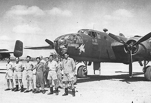 | A combat crew in front of B-25 "Fair Dinkum" of the 13th Squadron of the 3rd Bomb Group. "Fair Dinkum was later burned up in the same Japanese air raid on Port Moresby as "Baby Blitz" above. | |