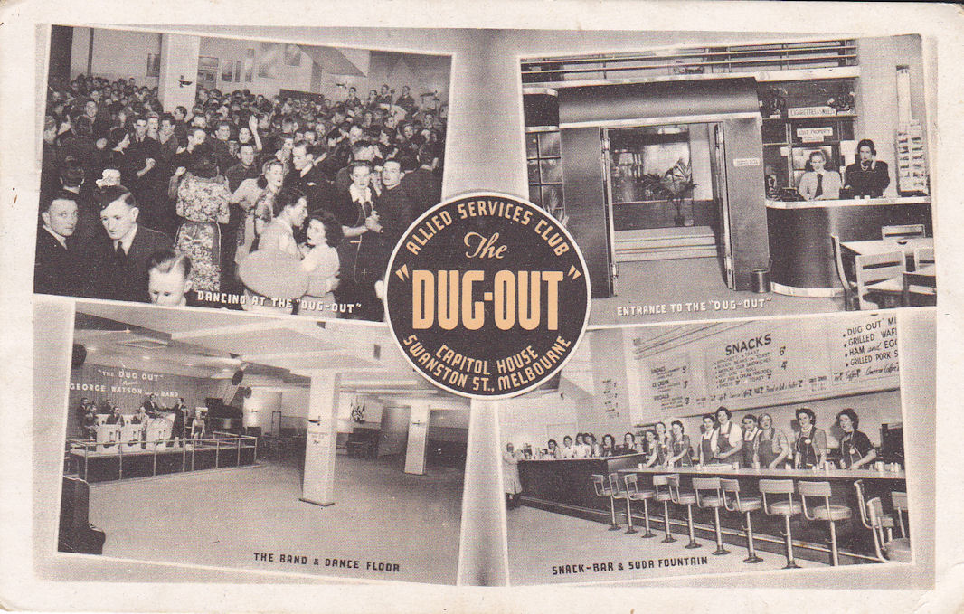 The "Dug-Out" was the Allied Services Club that was operated by the Myer Department Store in the Capitol Building in Swanston Street, Melbourne, Victoria during WWII. It was renowned for holding the best dances and concerts in Melbourne and troops used to meet there as a matter of routine.