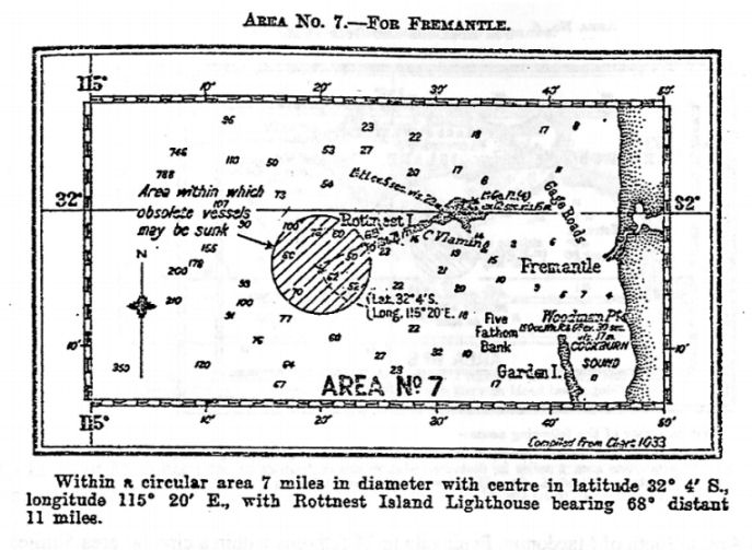 Area No. 7 located southwest of Rottnest Island off the coast of Western Australia near Fremantle is an area 7 miles in diameter about 11 miles away from Rottnest Island Lighthouse designated for the sinking of obsolete vessels. It was declared under the "Beaches, Fishing Grounds and Sea Routes Protection Act 1932".