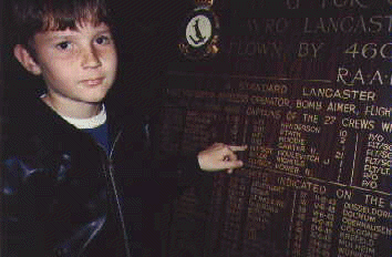 Simon Dunn, grandson of Jan Goulevitch, at the Canberra Memorial on 22 September 1984, pointing at his grandfather's name on the Memorial Board in front of the famous Lancaster "G" for George. |