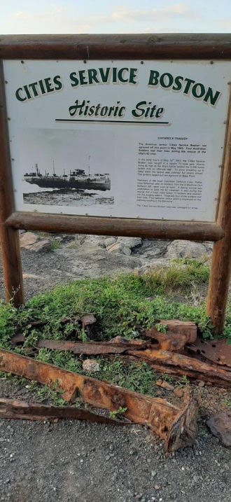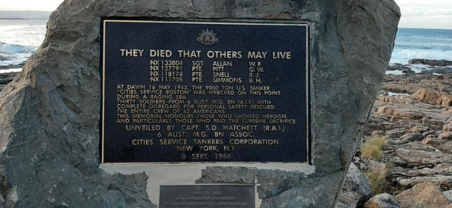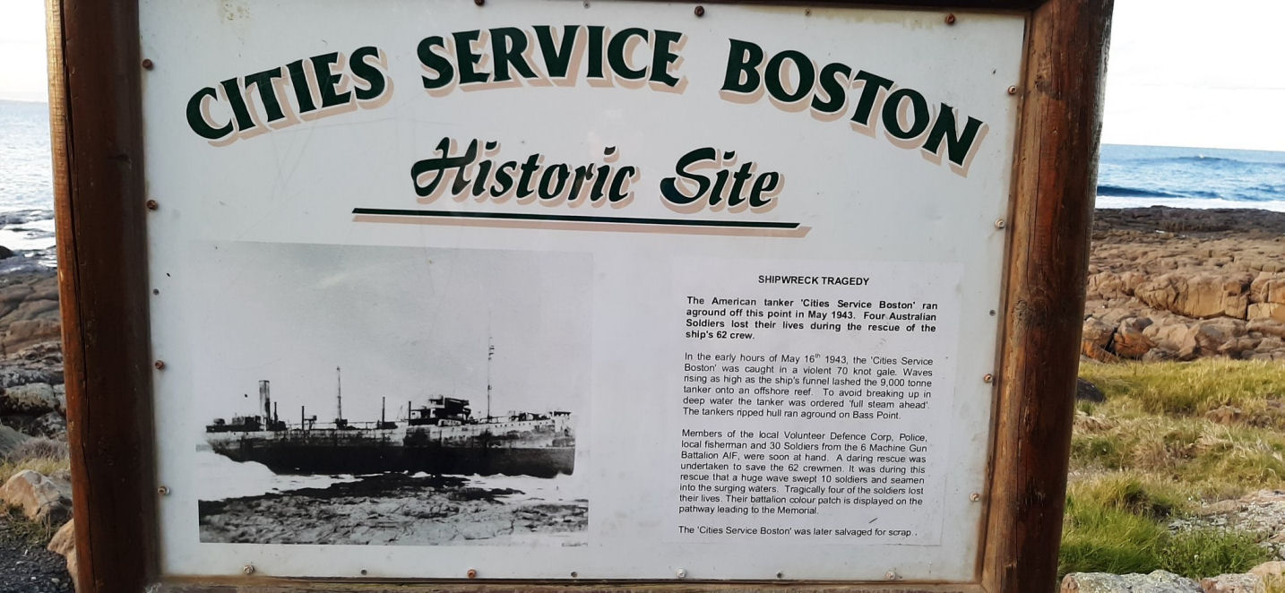 The "SS Cities Service Boston", a 9,348 tons oil tanker, ran aground at Bass Point in New South Wales in a bad storm on 16 May 1943. "SS Cities Service Boston" had been in convoy PG50 four days earlier, when the convoy was attacked by Japanese submarine I-180.