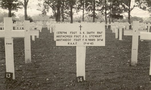 On the night of 16 April 43 , Lancaster ED711 Mk III (UV-U) took off at 2059 hrs from Breighton. Crew Listing was ; F/Sgt D.E.White, DFM, RAAF; Sgt J.S.Stewart, RAAF, (Unfortunately this was his first flight as he had just landed at the squadron and was only flying as second pilot to gain experience); Sgt B. Knilands, RAAF; W/O W.R.K.Charlton, RAAF; F/Sgt F.S. Ward, RAAF; F/Sgt A.K.Parker, RAAF; F/Sgt A.K. Smith, RAAF; F/Sgt R.H. Baker. All the crew were killed on the night and are buried in Durnbach War Cemetery. Site of the crash is unknown.