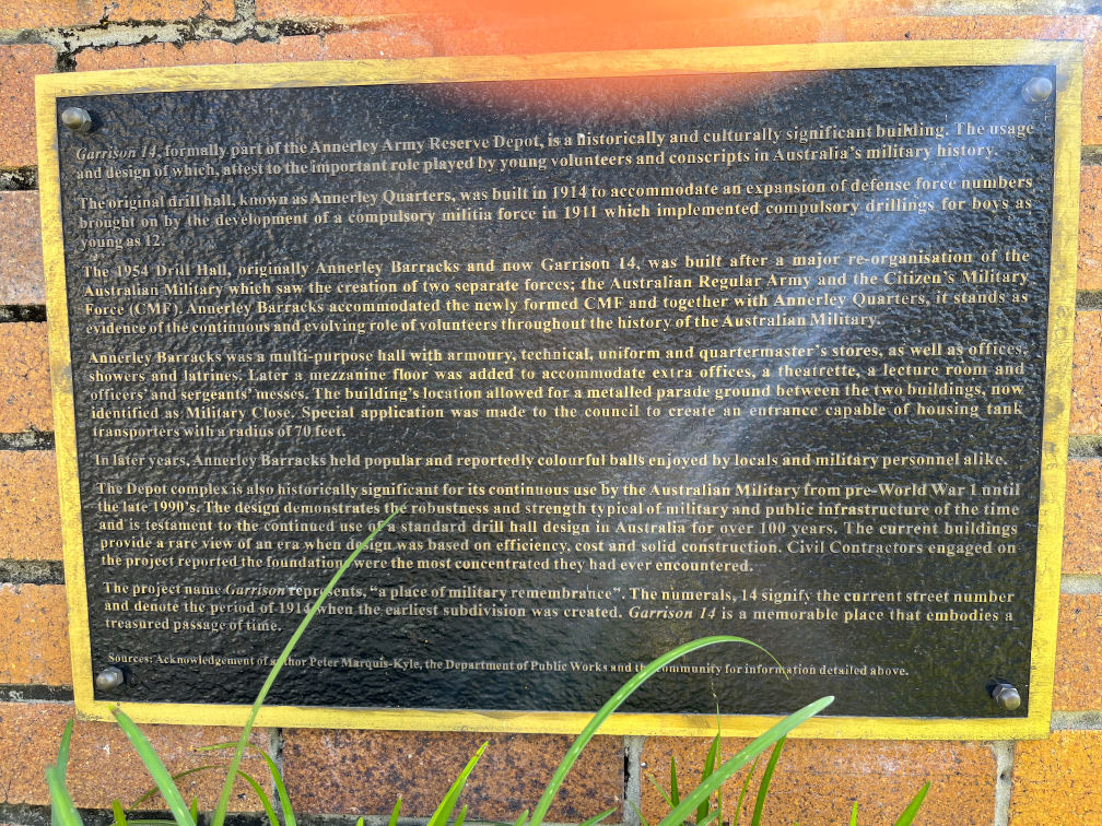 In more recent years the Annerley Drill Hall area has been converted into an accommodation area comprising the original Annerley Drill Hall from WWI and WWII known as Annerley Quarters and the 1954 Army Drill Hall Building known as Garrison 14.