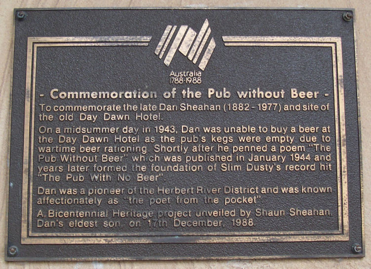 Dan Sheahan had gone to his favourite pub for a cold beer but was told by the Publican Gladys Harvey, that there was no beer left, due to a drinking binge by some coloured American soldiers the previous night. Dan Sheahan consoled himself in the corner of the pub with a glass of wine and wrote the song "A Pub without Beer". It was first published in the Townsville Daily Bulletin on Thursday 30 December 1943 and later published in the NQ Register in January 1944. The song was later transformed to "A Pub with No Beer" by composer Gordon Parsons, who had spotted the words of "A Pub without Beer" in "The North Queensland Register" newspaper.