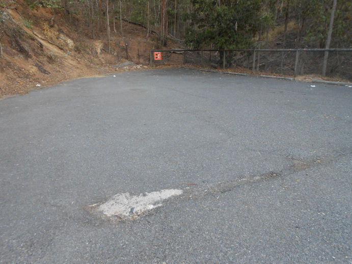 The remains of Armco Magazine M28 of the US Naval Magazine and Mine Assembly Depot on Mount Coot-tha are located at the last car park and turnaround area at the Simpsons Falls Picnic Area. A small section of the original concrete foundation of Armco M28 was visible through the bitumen cover in 2018.