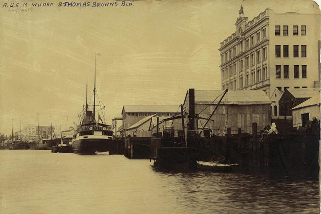 Ships tied up at the wharves in front of the Thomas Brown building, Brisbane, ca. 1898