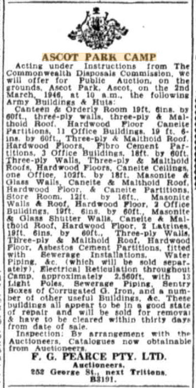 The various temporary huts at Camp Ascot Park were auctioned off to the public on 2 March 1946 by Auctioneers F.G. Pearce Pty. Ltd. on behalf of the Commonwealth Disposals Commission as follows:-