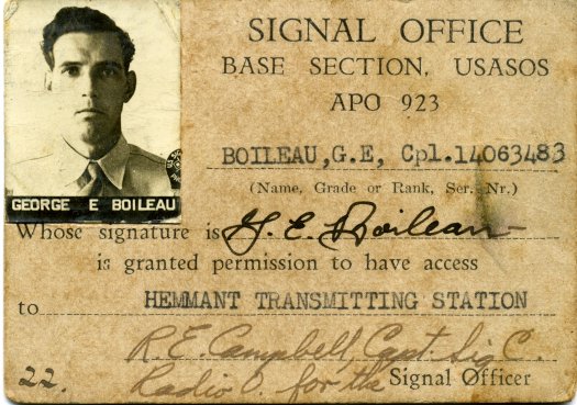 Pass for Corporal G.E. Boileau (14063483) to access the Hemmant Transmitting Station
