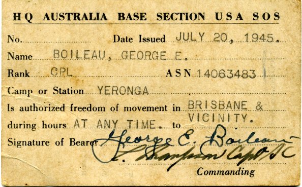 Corporal G.E. Boileau (14063483), who worked at the top secret Hemmant Transmitting Station, was living at Camp Yeronga in about July 1945.