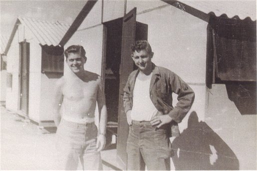 Ken Osterberg on the right in front of the small huts at Camp Yeronga
