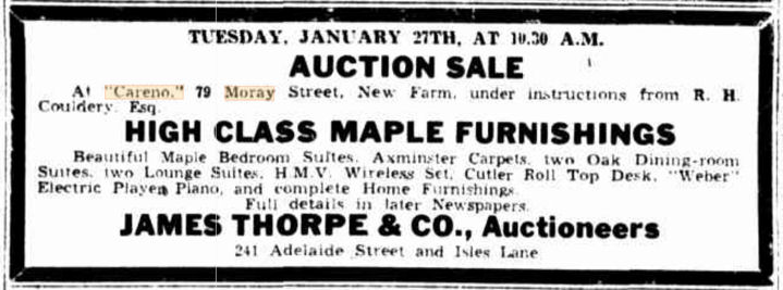 "Careno" at 79 Moray Street, New Farm, at the river end of Barker Street, was used by the Brisbane Section of the RAAF Service Police Unit during WWII. "Careno" had previously been owned by Mr. R.H. Couldery. See his advertisement below for the Auction Sale at "Careno" at 10:30am on 27 January 1942 to sell his furnishings inside "Careno".