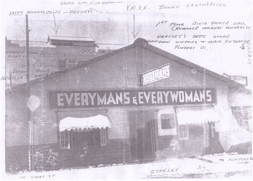 Everyman's Welfare Service established an Everyman's Hut in Stanley Street, Townsville during WW2. It was located between Flinders Street and Sturt Street. To the right of the store in the above photograph was Lowth's Hotel. Heatley's Department Store can be seen behind the Everyman's Hut. Old time dances were held on the first floor of the Heatley's building. Access was via Sturt Street. Heatley's Store itself was located on the ground floor and was accessed via Flinders Street.