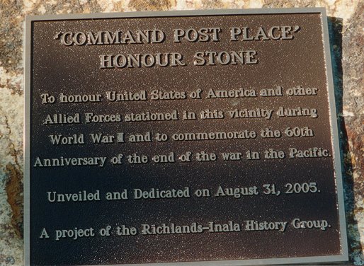 To commemorate the presence of so many US troops in these camps, as well as other Allied forces, an Honour Stone was erected in Homestead Park, Forest Lake (Command Centre for the Ordnance Depot) by the Richlands-Inala History Group. This Honour Stone was unveiled and dedicated at 10.00 am on Wednesday, 31 August 2005.