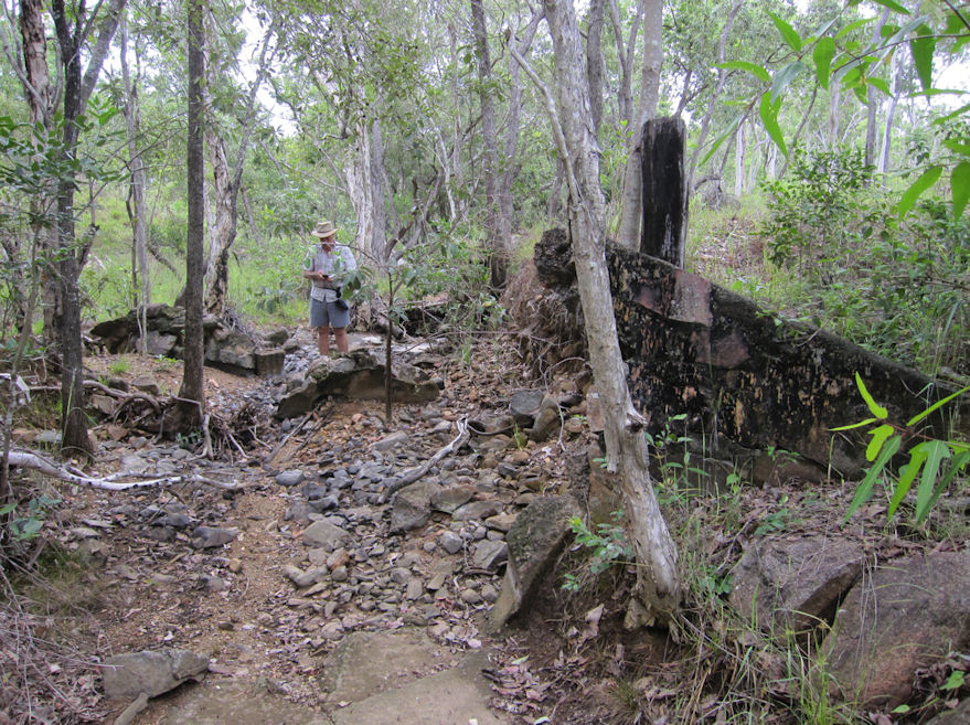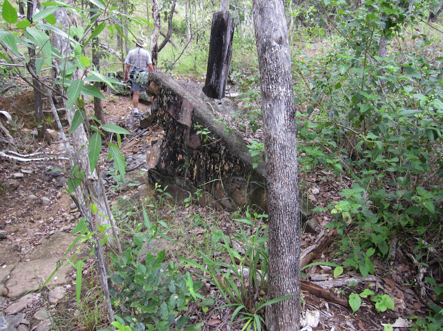 The broken remains of a concrete bridge built over a small creek on the access track into the site.