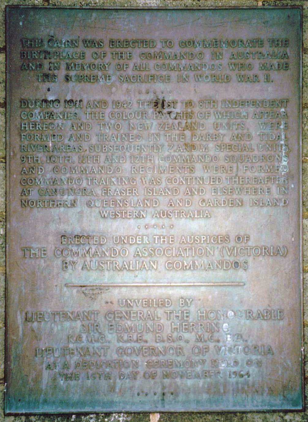 This cairn was erected to commemorate the birthplace of the Commando in Australia and in memory of all Commandos who made the supreme sacrifice in World War II.