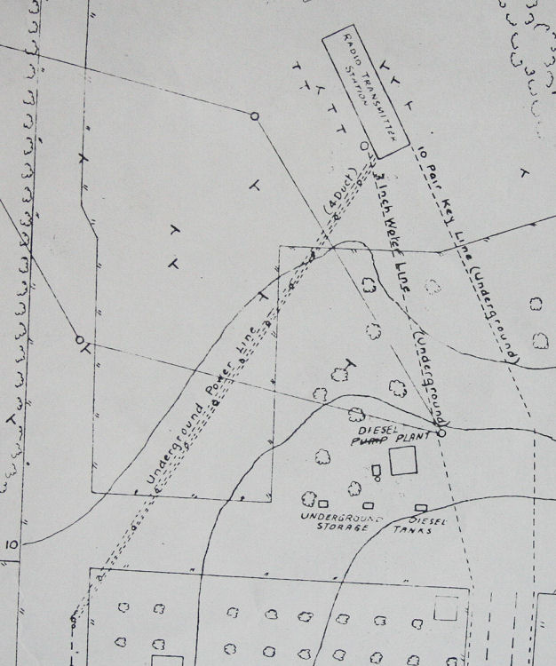 The site was patrolled day and night by civilian guards on horseback who would continually ride around the perimeter of the radio site. There was a diesel pump plant house and four underground diesel fuel tanks. The large Radio Transmitter Station building was serviced by underground power, a 3 inch water underground pipeline and an underground 10 pair key line.