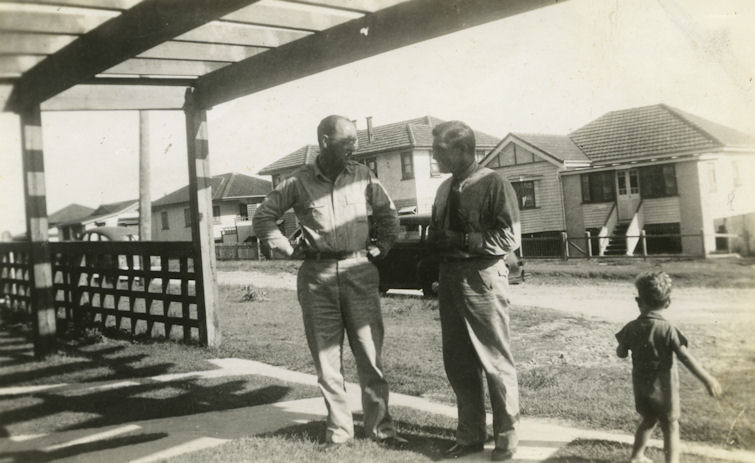 right) talking with Major Elden in early 1944 in front yard of "Strathallan".