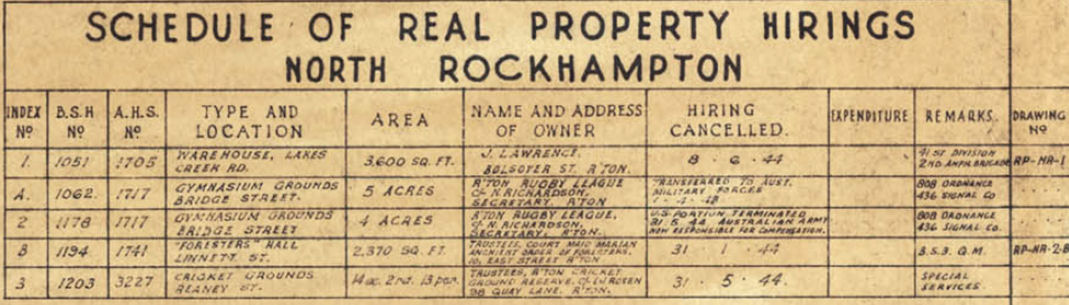 The above Table shows that Area "A" was the Gymnasium Grounds, comprising 5 acres, in Bridge Street owned by the Rockhampton Rugby League, care of N. Richardson, Secretary. Area "2" was another 4 acres in the same area also owned by the Rockhampton Rugby League. The Table shows that both locations were occupied by the 808th Ordnance Light Maintenance Company and the 436th Signal Construction Battalion (Aviation).