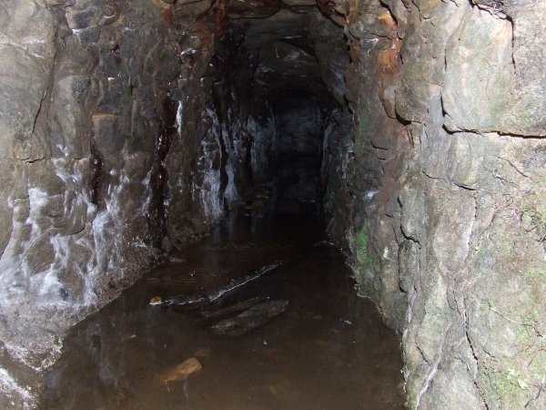 The small tunnel is about 4 - 5 ft high and is directly above the main railway tunnel portal. The smaller tunnel extends into the rock for about 30 ft and turns right and goes for only another 3 feet. The small tunnel is 6 ft wide at best. To access this small tunnel you have to traverse down a rugged slope about 300 m from the nearest vehicle track.